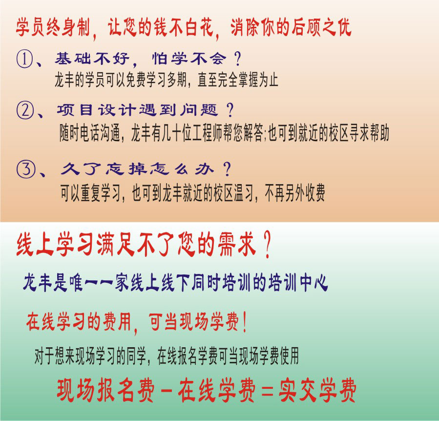 龍豐所屬學員都可以在龍豐 任何一個校區(qū)重新學習,或尋求技術支持, 不再收費