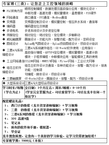 凡在即日起~3月31號在龍豐任一校區報名專家班課程的學員即獲送價值1680元大禮包(西門子視頻398元一套,三菱視頻398元一套,西門子300視頻680元一套,32G 高速U盤,筆記本,畢業證等)