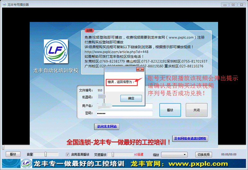 若無權限播放視頻會彈出如下提示,請確認是否購買過該視頻,或確認序列號是否兌換成功: